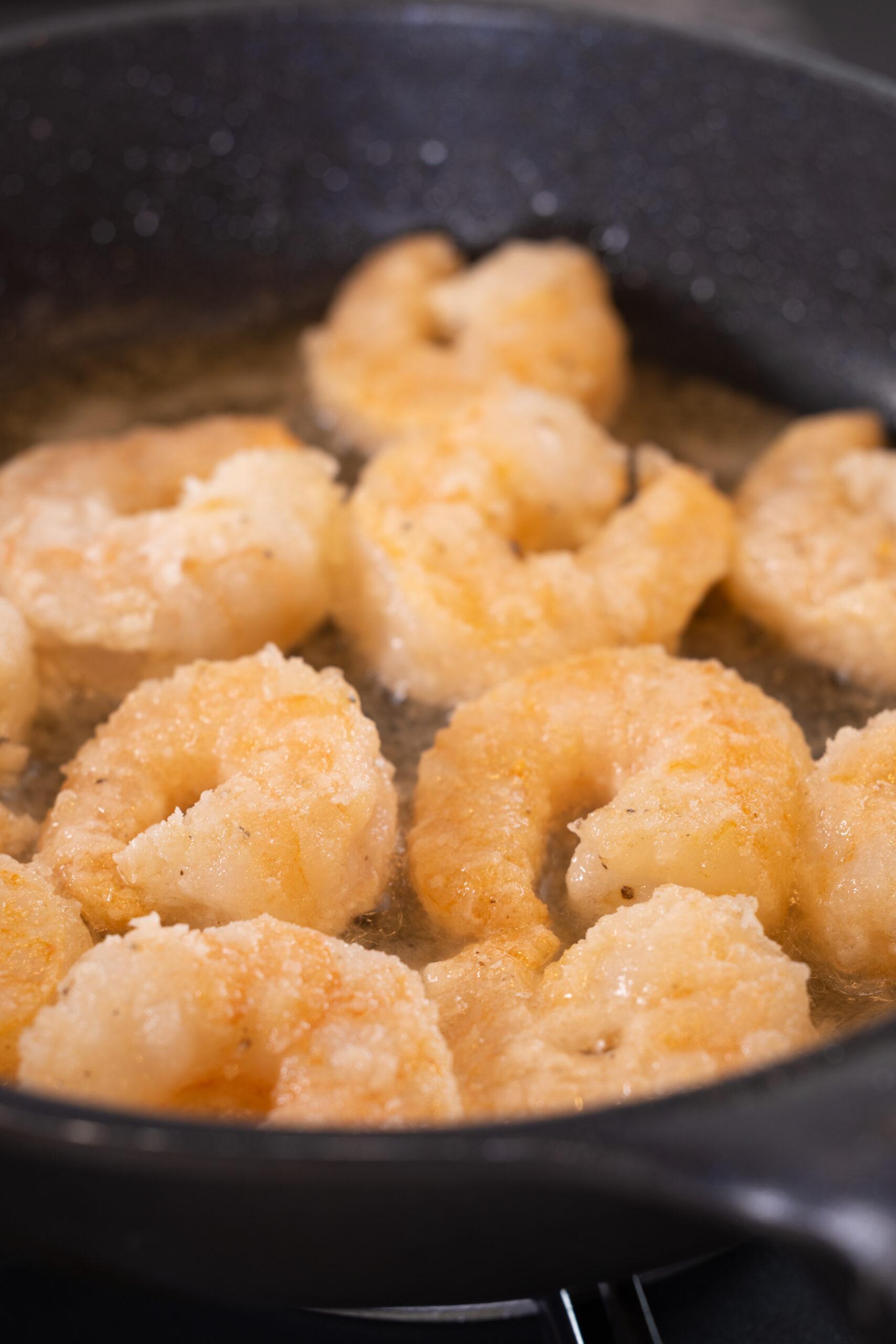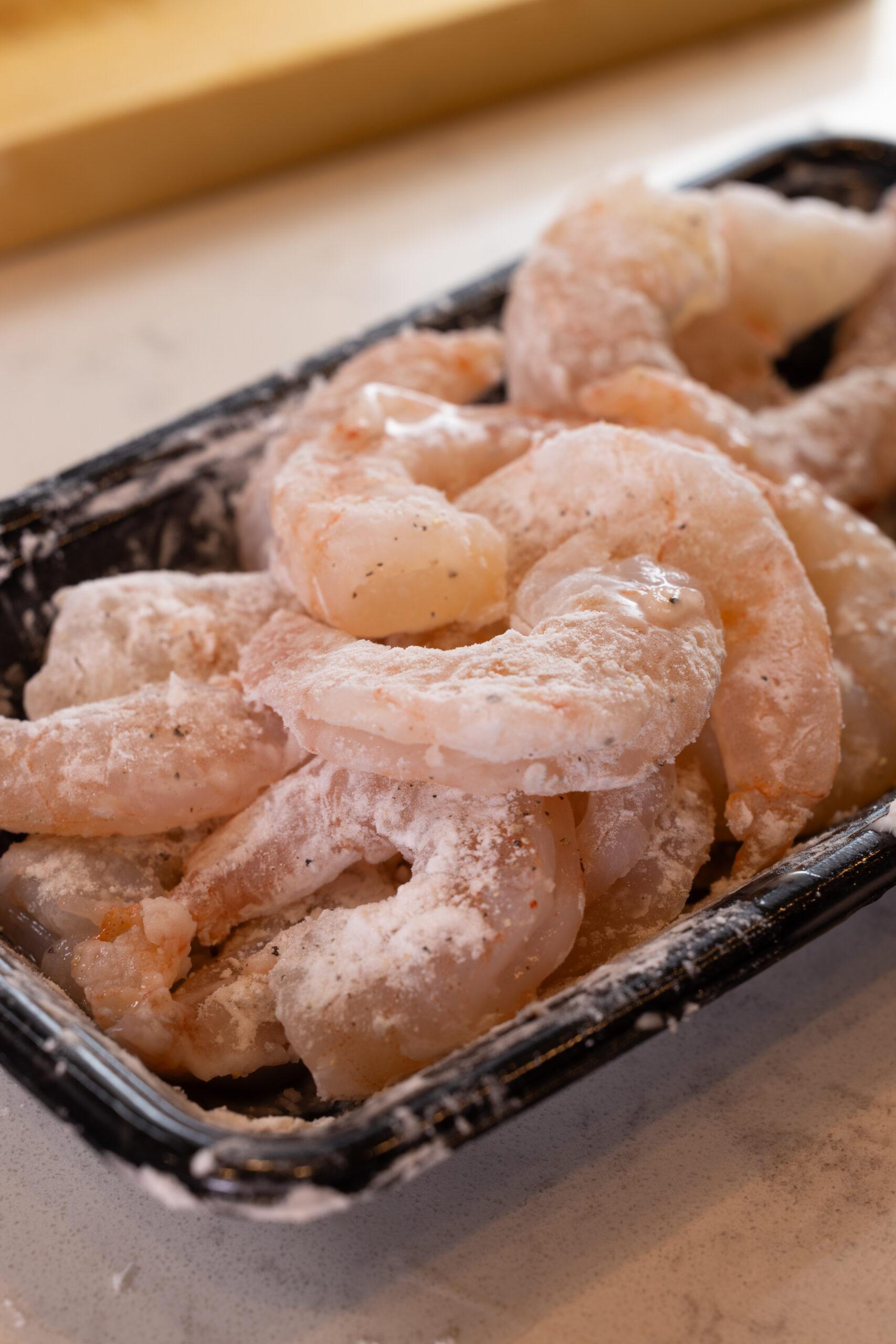 むきえびに塩胡椒で下味をつけ、片栗粉をまぶす。