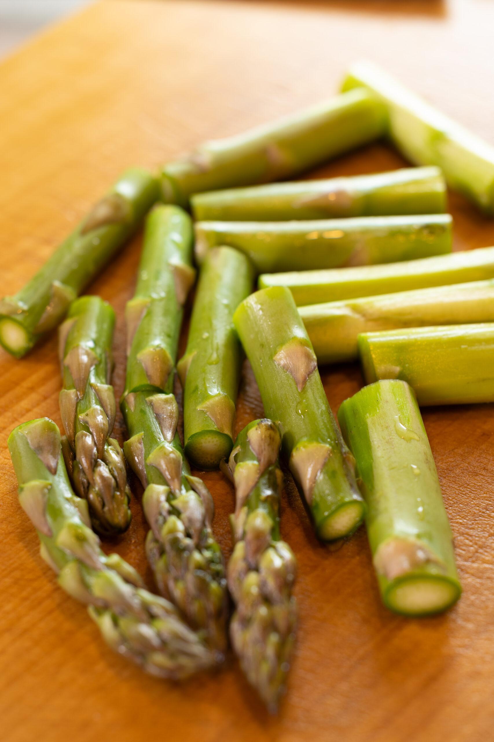 アスパラは根本の皮を薄くむき、4cm幅に切る。