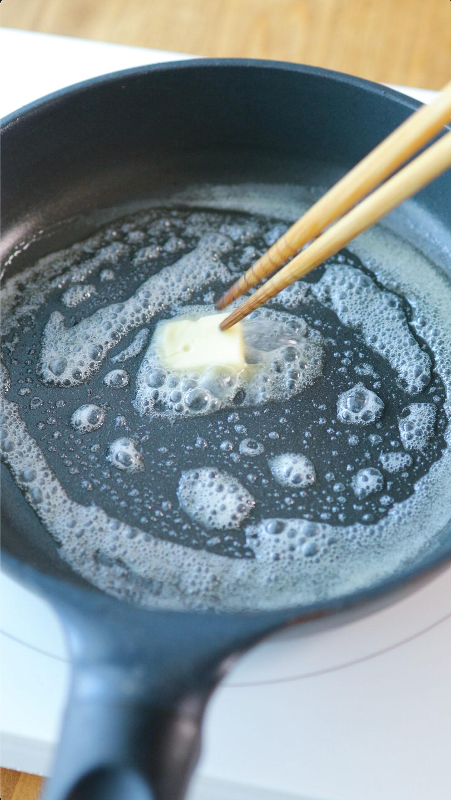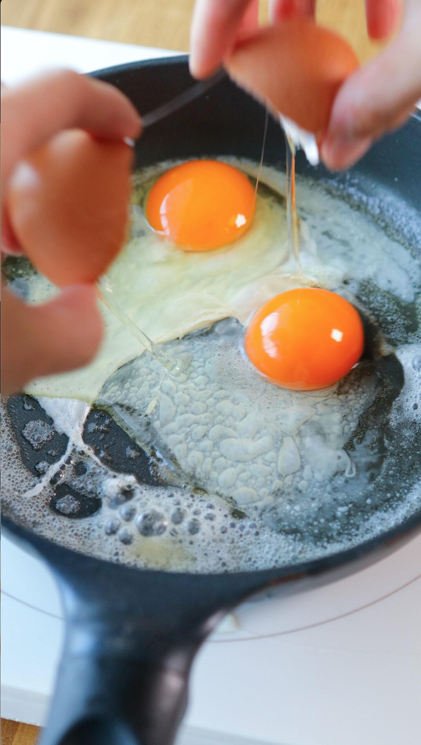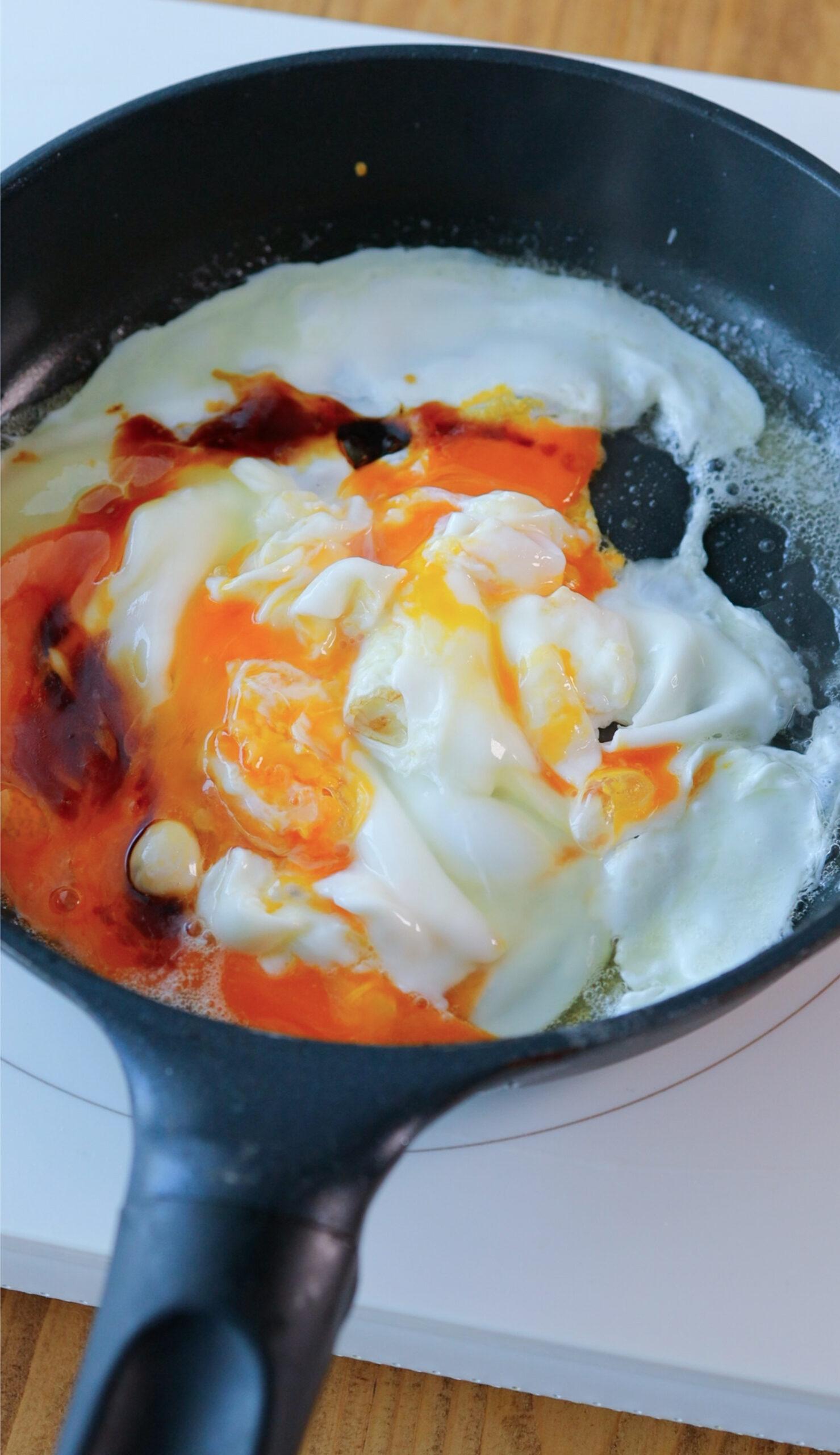 2. 卵を割入れ、白身が少し固まってきたら、混ぜる。