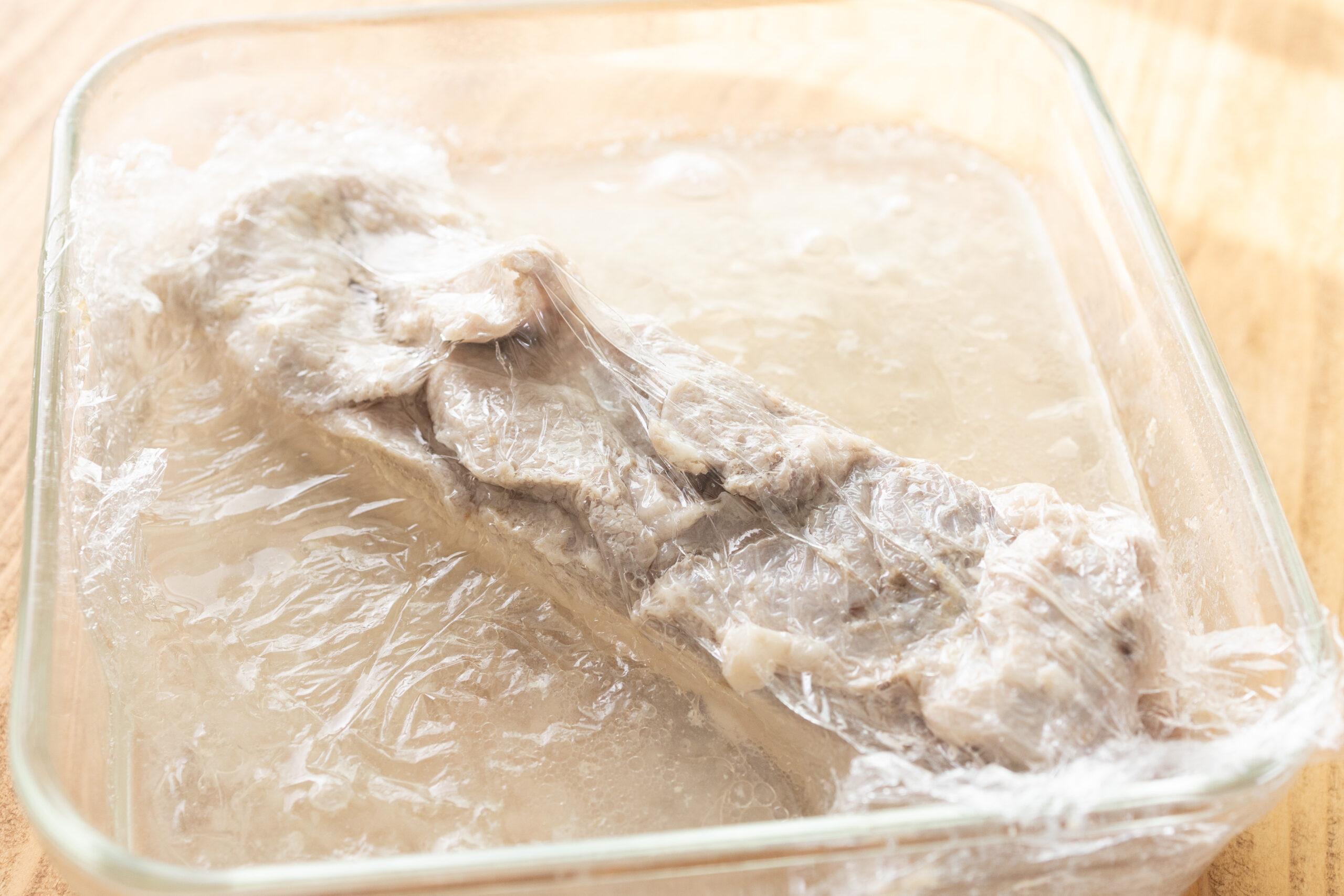 熱湯と酒を注ぎ入れ、ふんわりラップをする。レンジで600Wで10分加熱し、そのままラップを外さず1時間放置する。