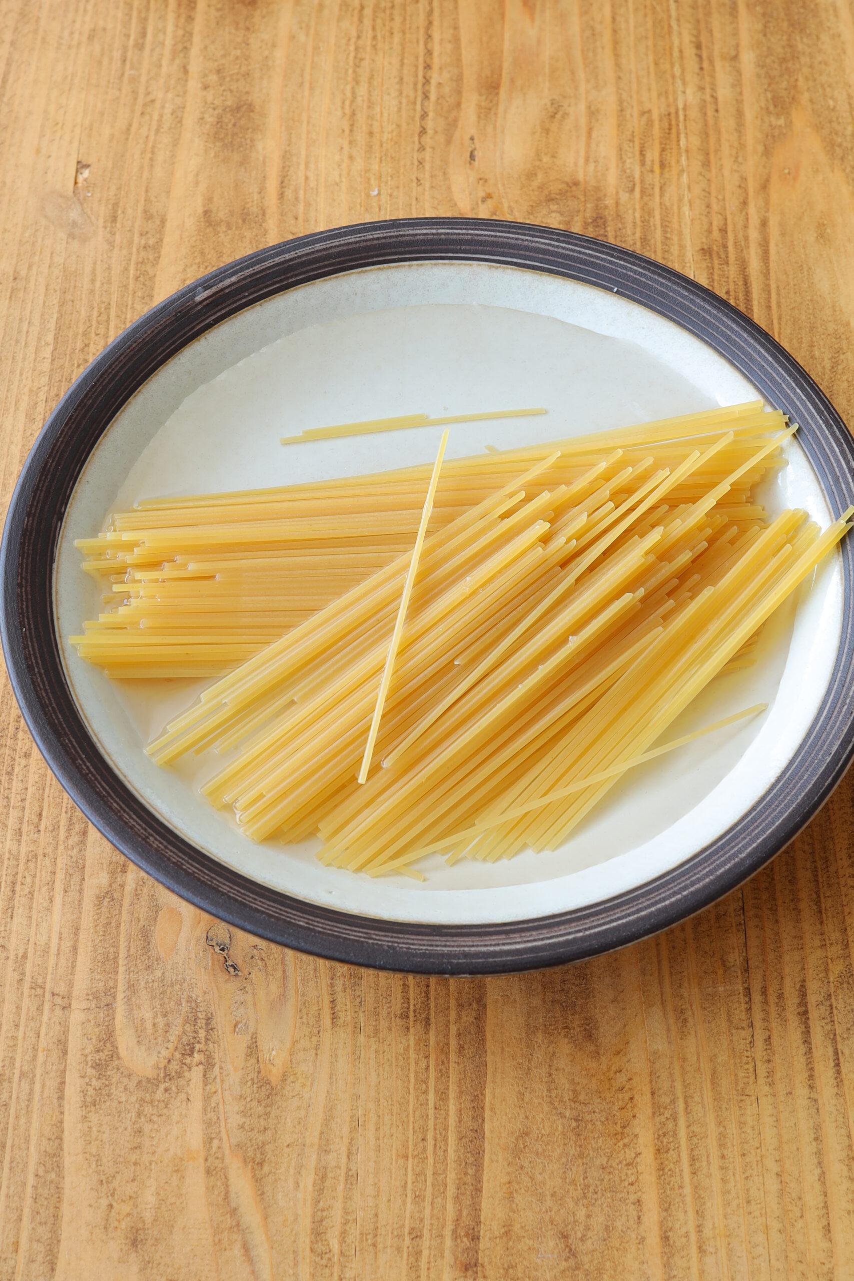 1. 深さのある耐熱皿に、パスタを半分に折って入れる。Aを加え混ぜて、レンジで600Wでパスタの茹で時間通りに加熱する
