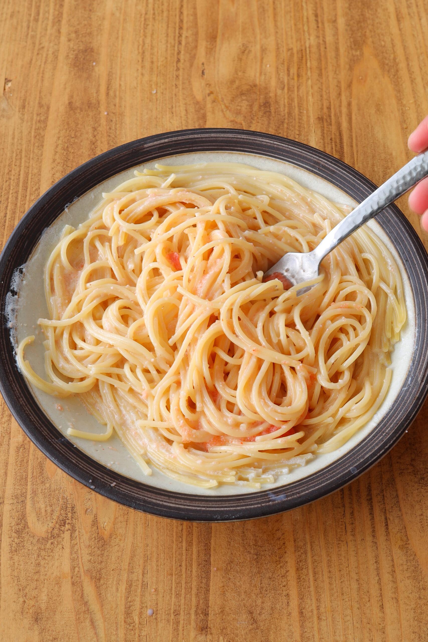 レンジで作る簡単パスタ。明太子のプチプチ食感と牛乳のクリーミーさが合わさって食べる手が止まりません。