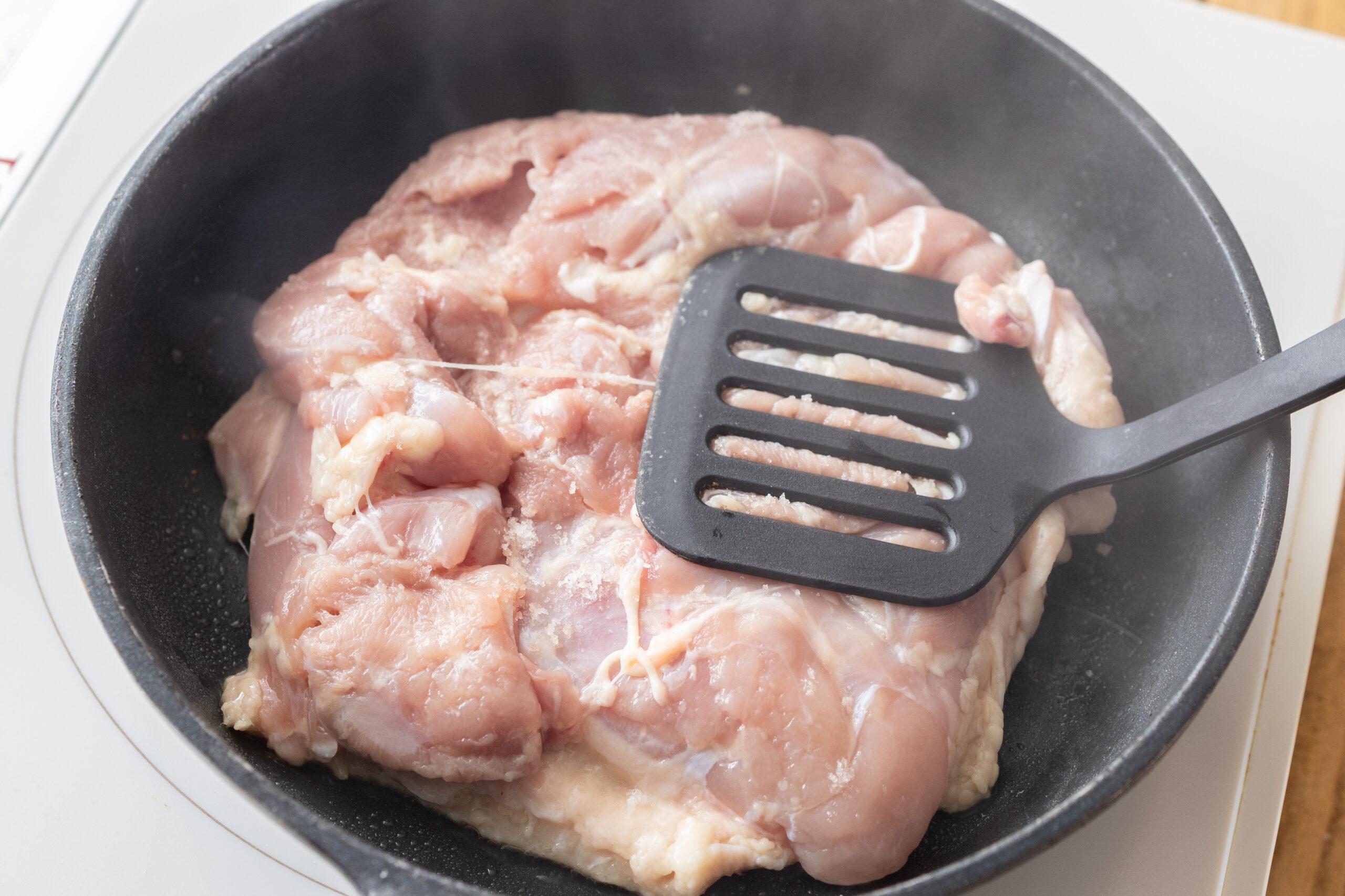 フライパンに油を引かず、鶏肉を皮目から中火で焼く。焼く前に塩をふる。