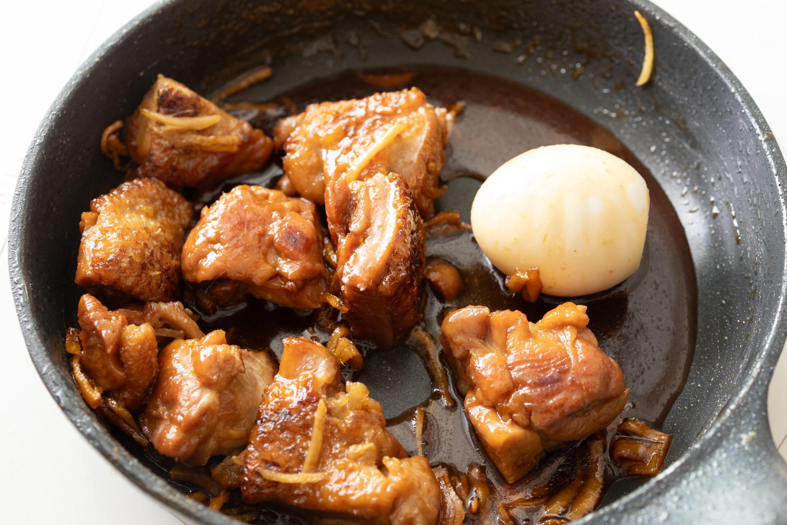 フライパンに②、Aを加えて煮たったら落とし蓋をして弱火で20分煮る。ゆで卵をいれて煮絡める。