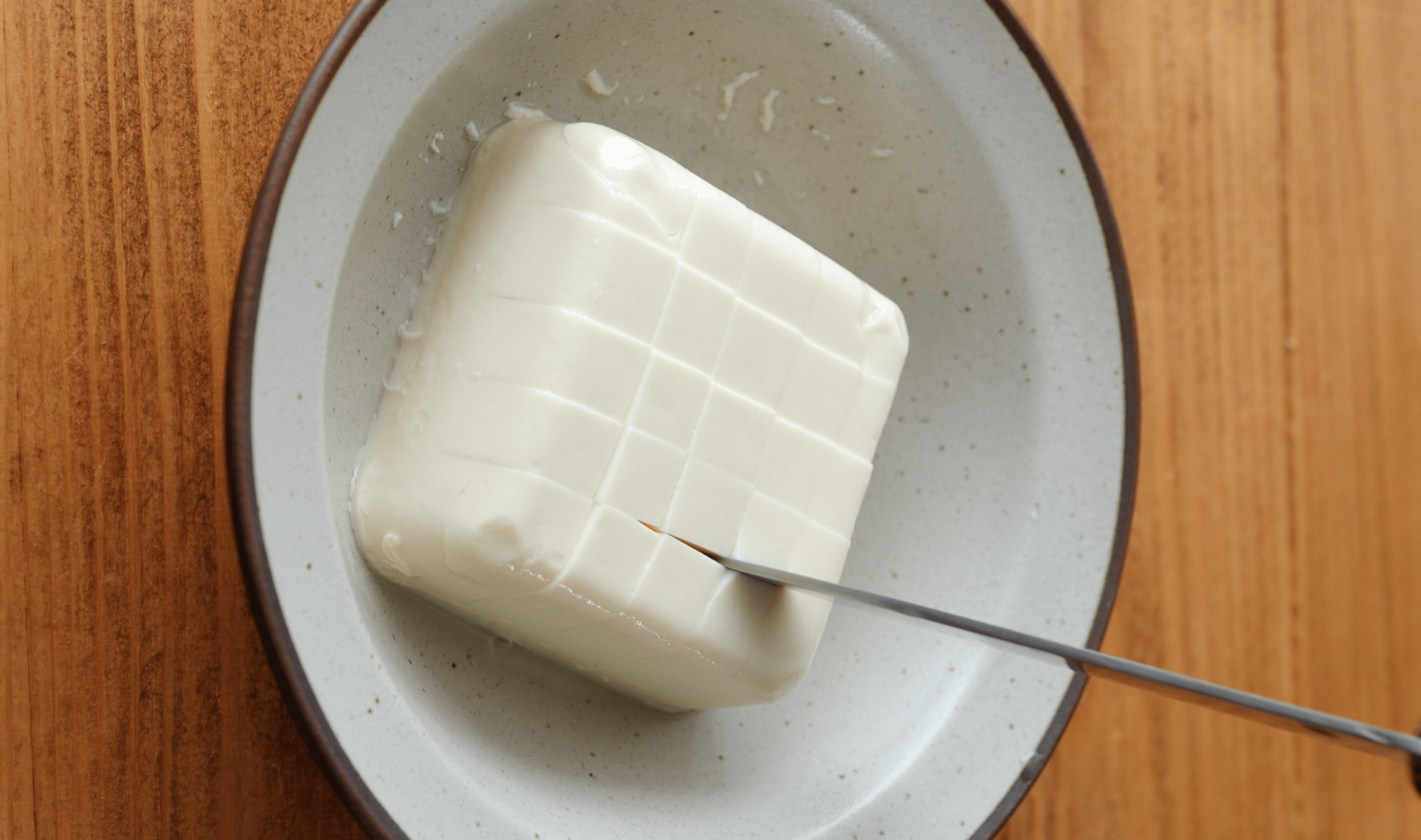 1. 温めた豆腐に格子状に切り込みを入れる。
