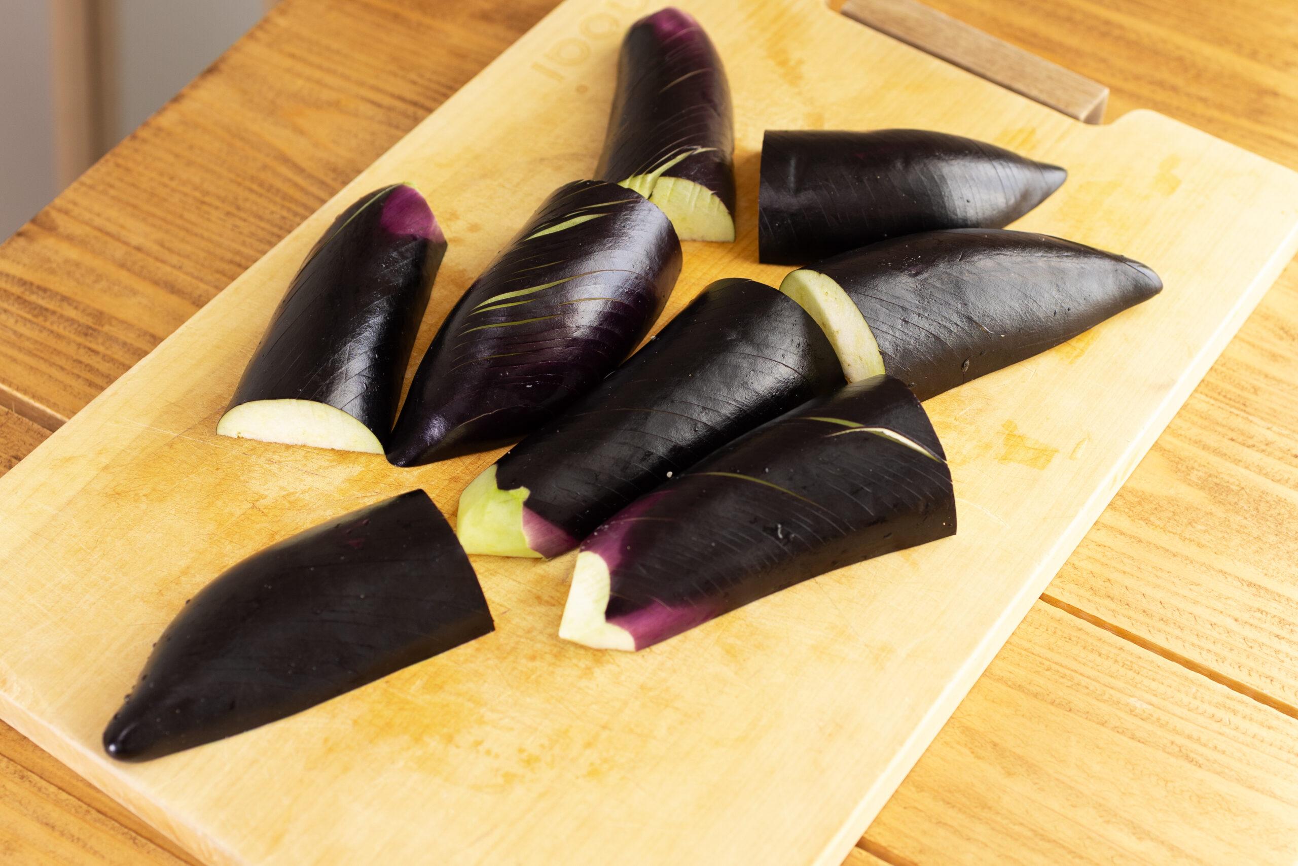 なすは縦半分に切る。皮に切り込みを入れる。半分に切る。