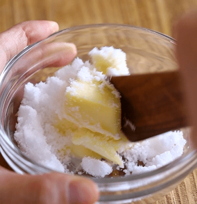 レンジで600Wで30秒加熱しバターを柔らかくし、砂糖を加えて混ぜ、キャラメルソースを作る。