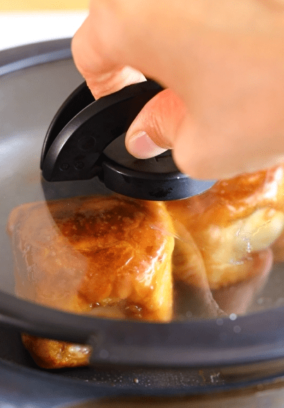 ②の上下の面にキャラメルソースを塗り、塗った面を下にしてフライパンで焼く。転がして全体的に焼き色がついてきたら蓋をしてチーズが溶けるまで焼く。