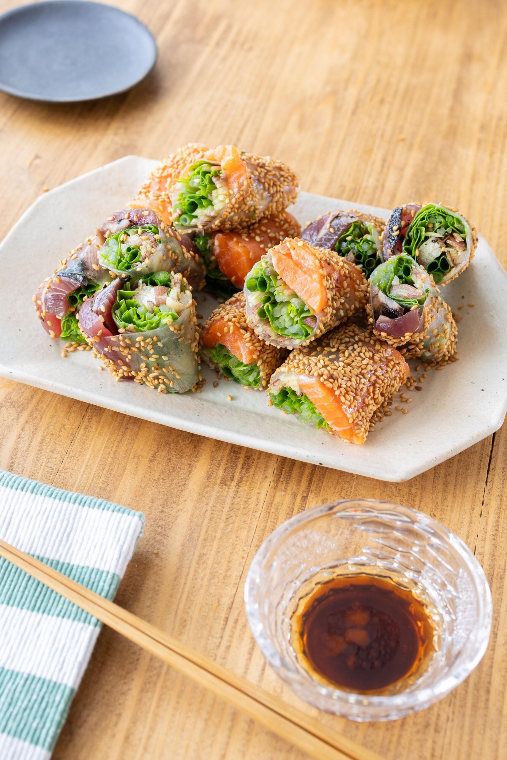 デパ地下みたいなごちそうお惣菜をお家で。 鰹とサーモンの生春巻き