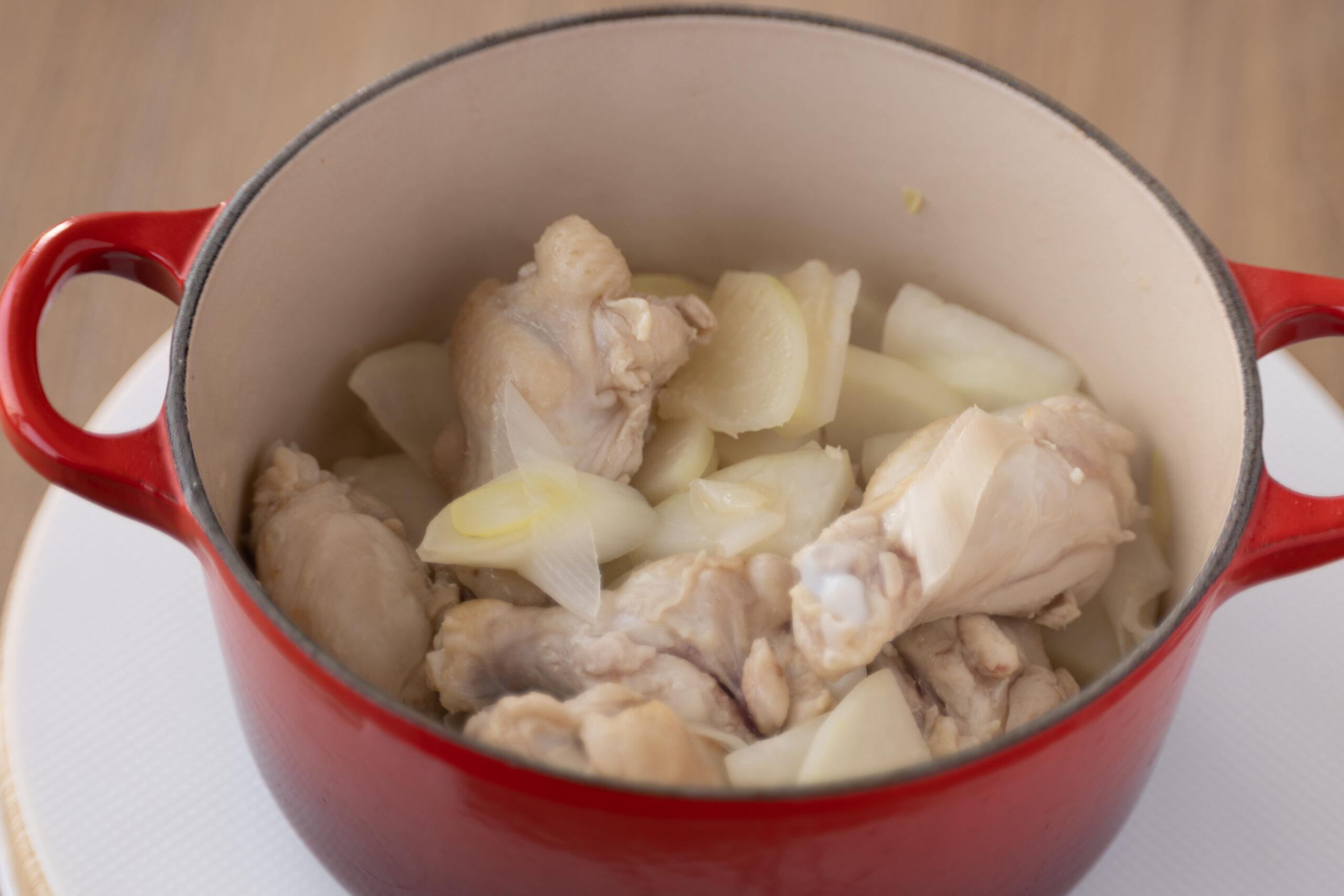 3. 鍋でごま油を中火で熱し、手羽元、長ネギ、大根を焼き色がつくまで焼く。