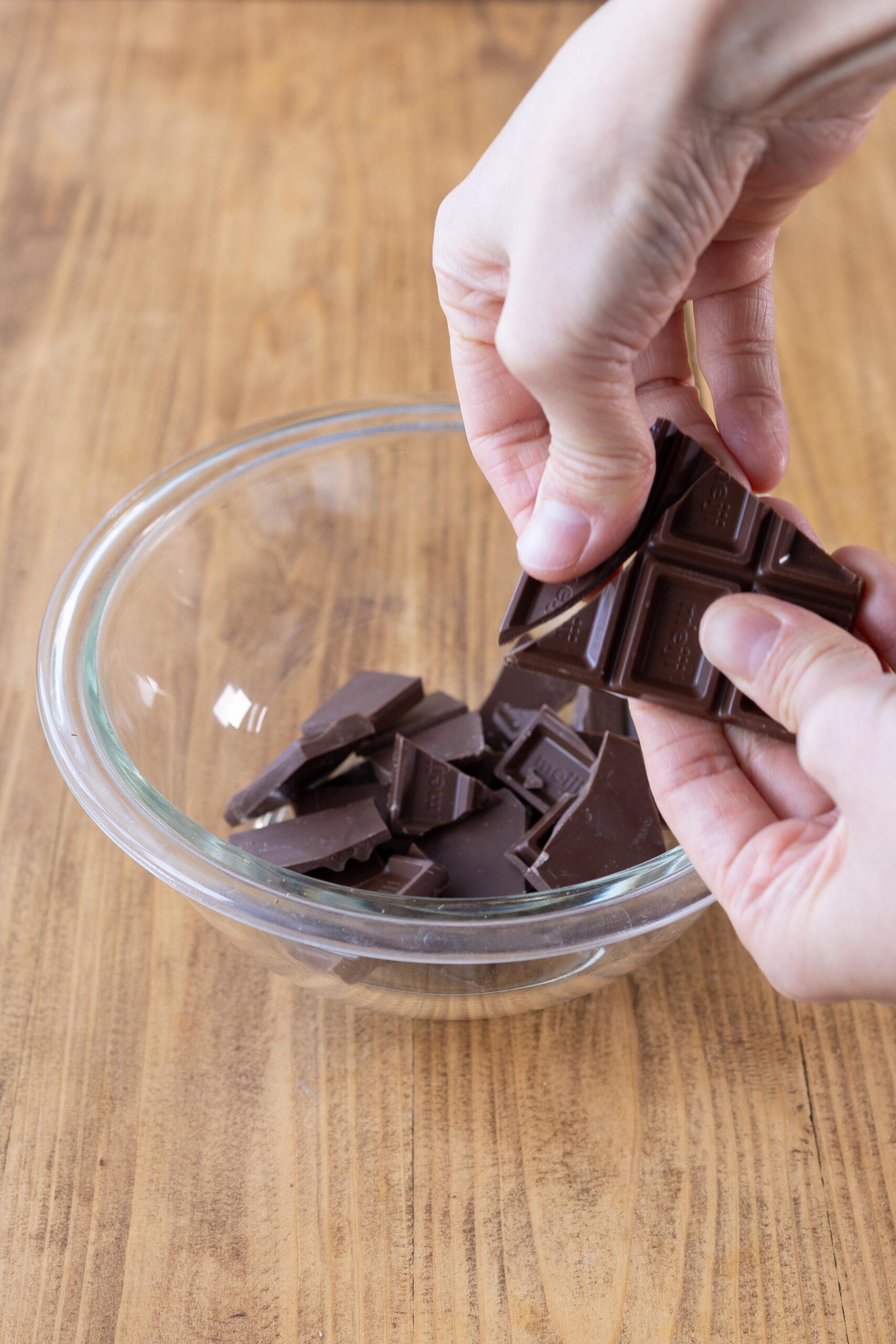 耐熱ボウルにチョコを細かく割り入れる。水を入れ、レンジで600Wで1分20秒加熱する。