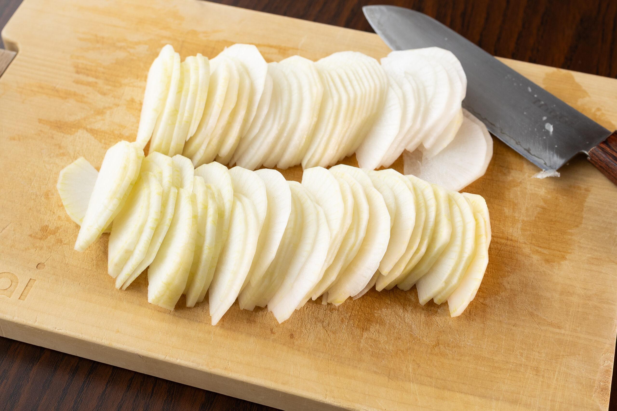 大根は皮を剥き、半分に切ってから超薄い半月切りにする。容器に入れる。