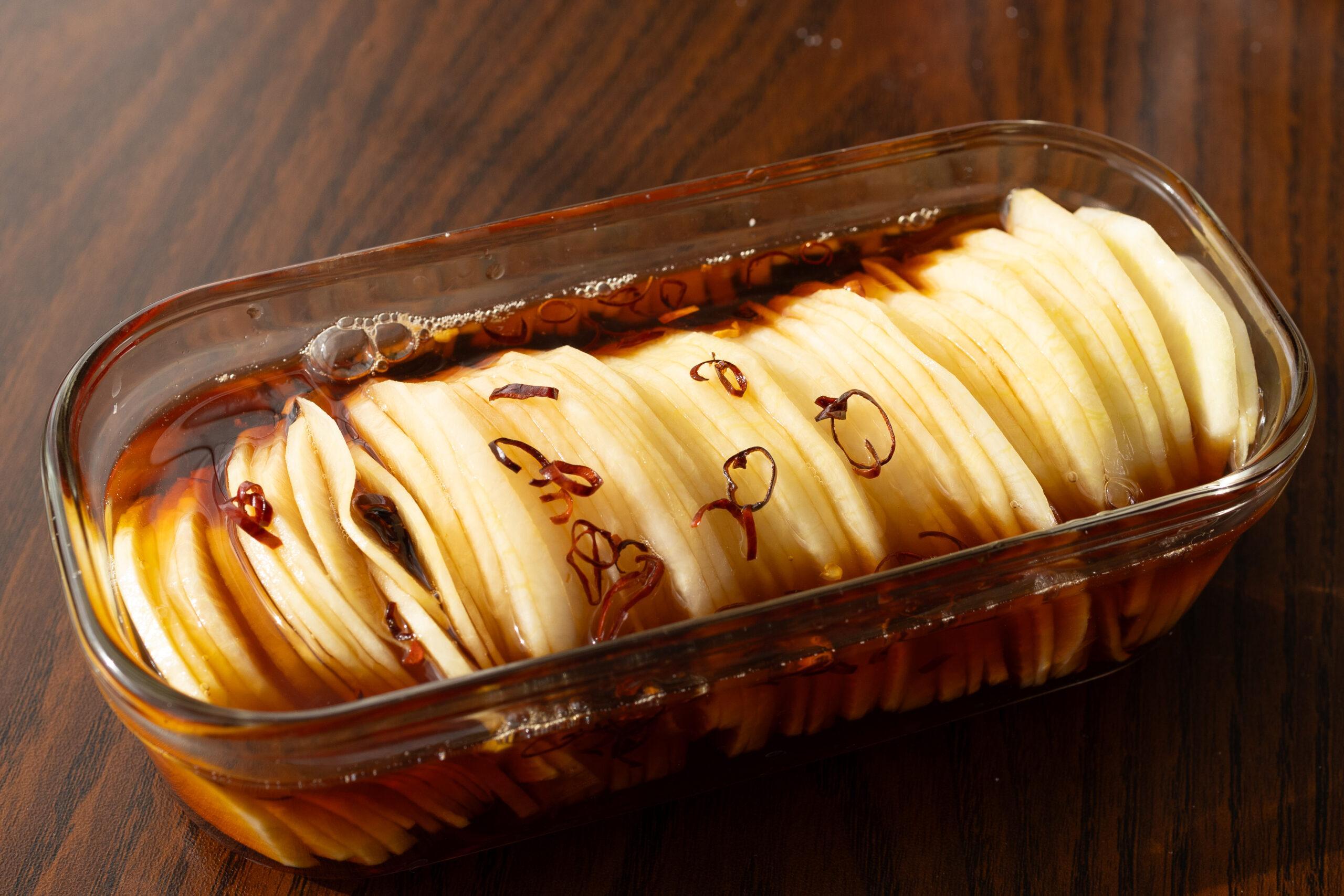 大根なら、安くてたっぷり作れるのがいい。 ぽりぽり食感が残るように薄切りにして、 つい箸が伸びる大根漬けにしました。