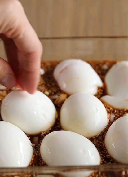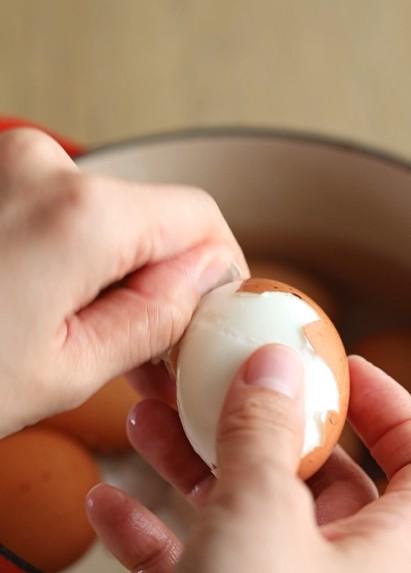 沸騰させたお湯に卵を入れて7分加熱し、冷水にさらして殻を剥く。