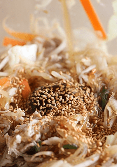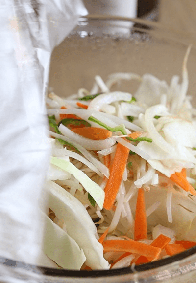 3. カット野菜をのせ、ラップをかけてレンジで600Wで8分加熱する。