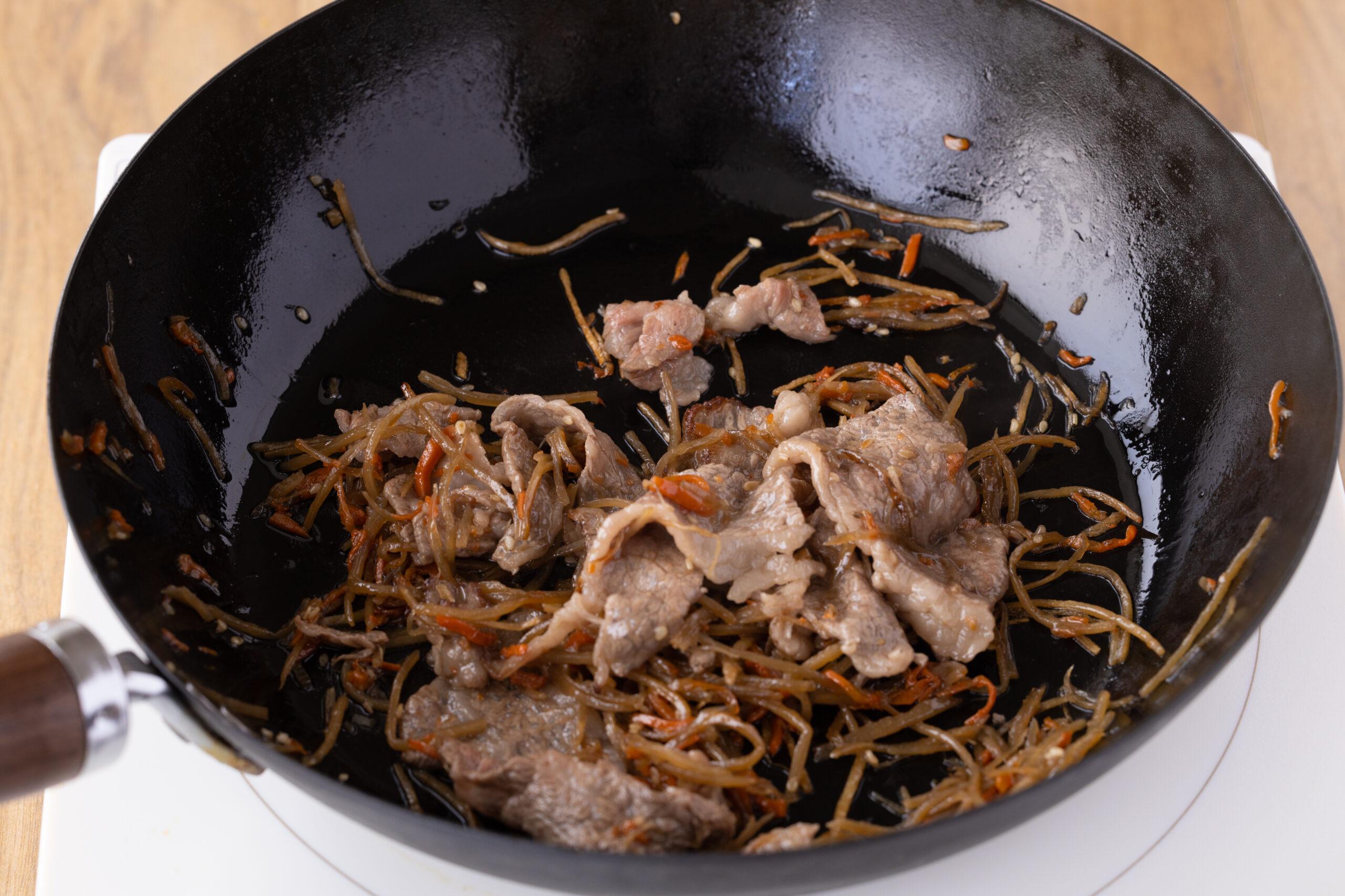 フライパンでごま油を熱し、牛肉、きんぴらを炒める。