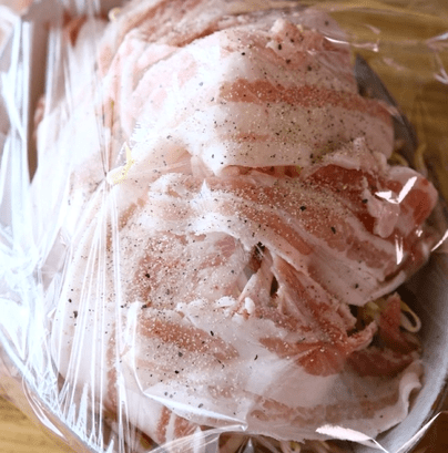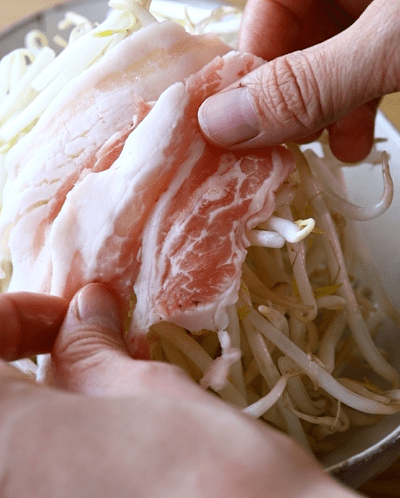 1. もやしの上に食べやすい大きさにちぎった豚バラを乗せる。
