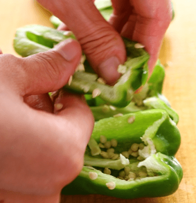 1. ピーマンは半分に切りヘタを取る。種は取らないまま押しつぶす。