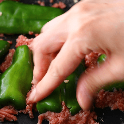 ひき肉をフライパンにドン!ピーマンを上からギュッ!ってするだけの“逆”肉詰め。