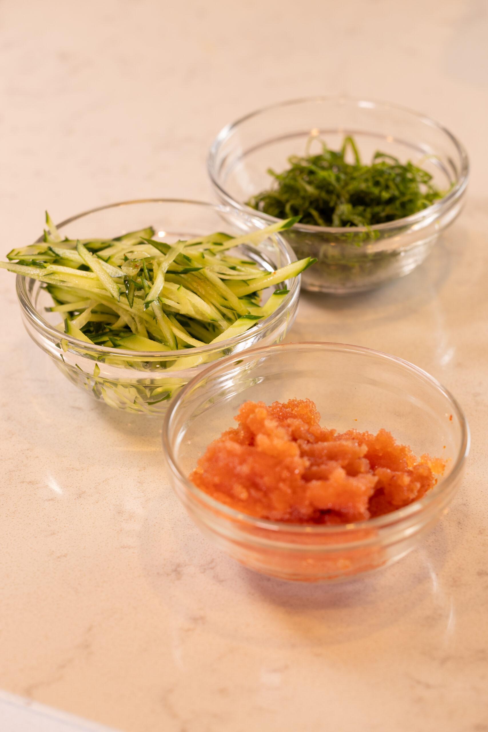 明太子は薄皮を取る。きゅうり、しそは千切りにする。