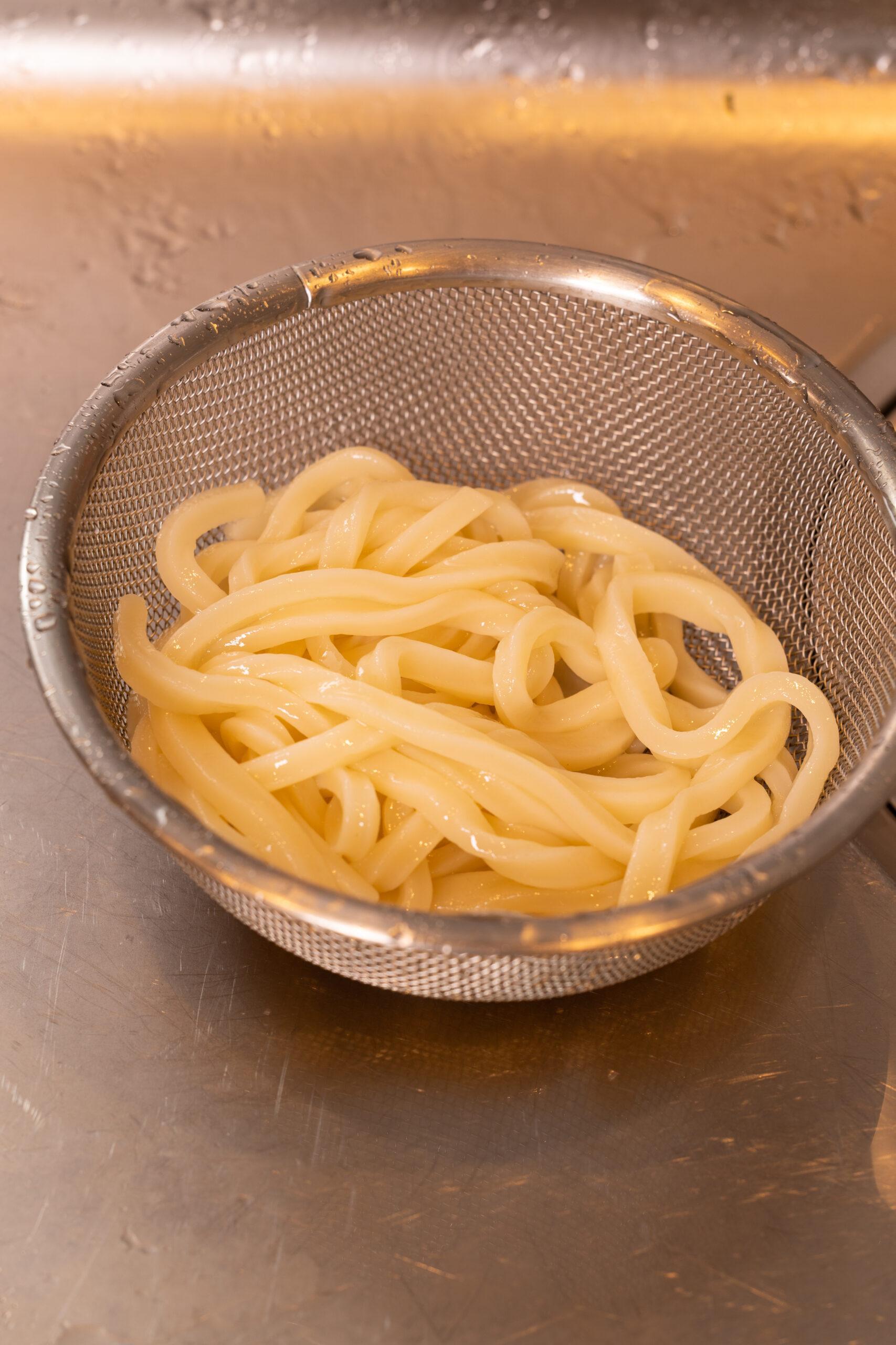 うどんは袋を開けてレンジで600Wで3分加熱する。流水にさらし、水を切る。