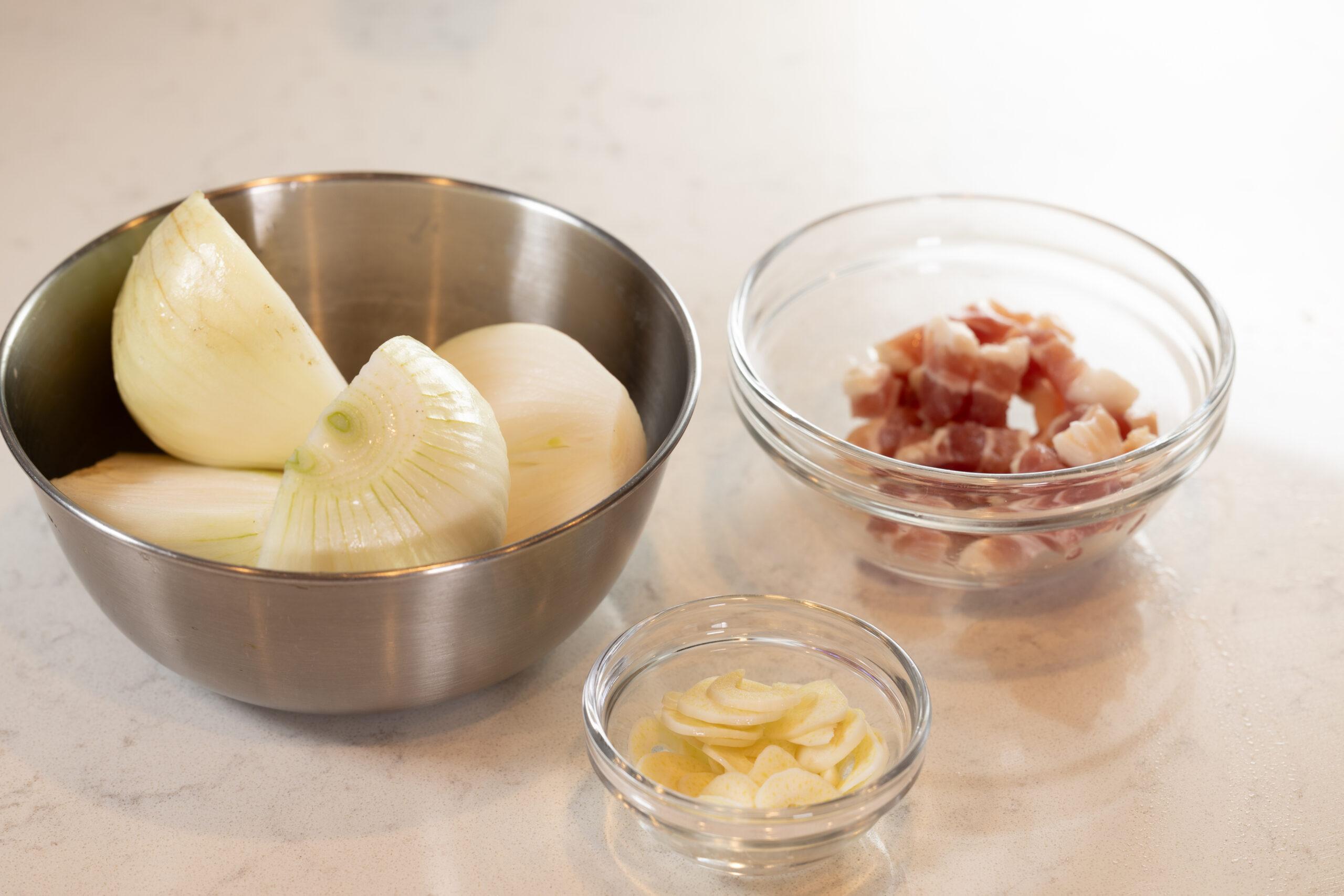 新玉ねぎは半分に切る。にんにくは薄切りにして、芯を取り除く。