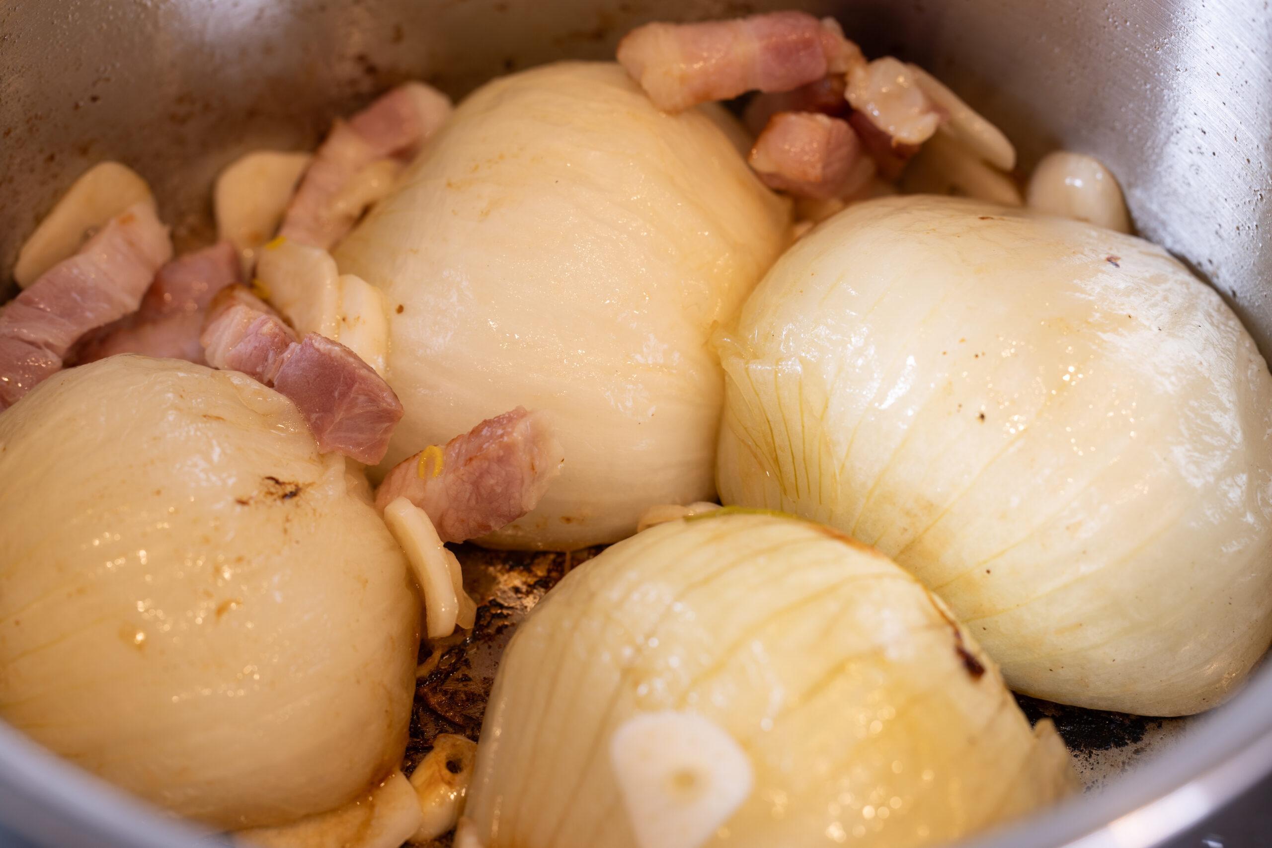 焼き色がついたらベーコン、にんにくを加えさらに5分蒸し焼きにする。