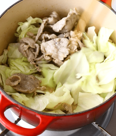 1. フライパンでごま油を中火で熱し豚肉に塩胡椒して炒める。豚肉の色が変わったらキャベツを加えてしんなりするまで炒める。