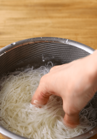 3. そうめんを規定時間茹でて冷水でしめる。器に盛り付け、②をかける。お好みで青ネギ、紅しょうが、白いりごまをトッピング!