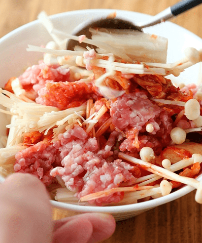 耐熱皿に豆腐、キムチ、えのき、ひき肉を入れて混ぜる。