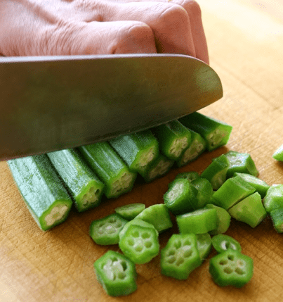 オクラを耐熱ボウルに入れてふんわりとラップをし、 電子レンジで600Wで1分加熱する。粗熱が取れたら5mm幅の輪切りする。