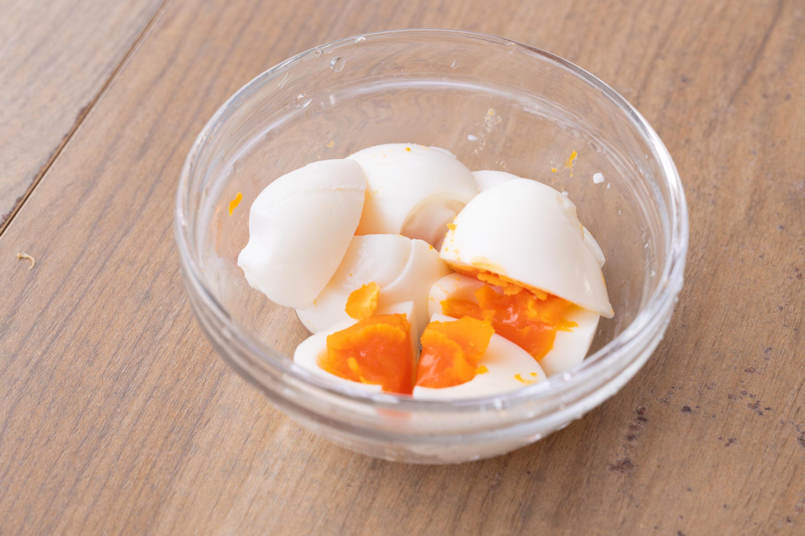 鍋で湯を沸騰させ卵を入れ、8分加熱したら、冷水に取り上げる。殻をむいて食べやすい大きさに切る。