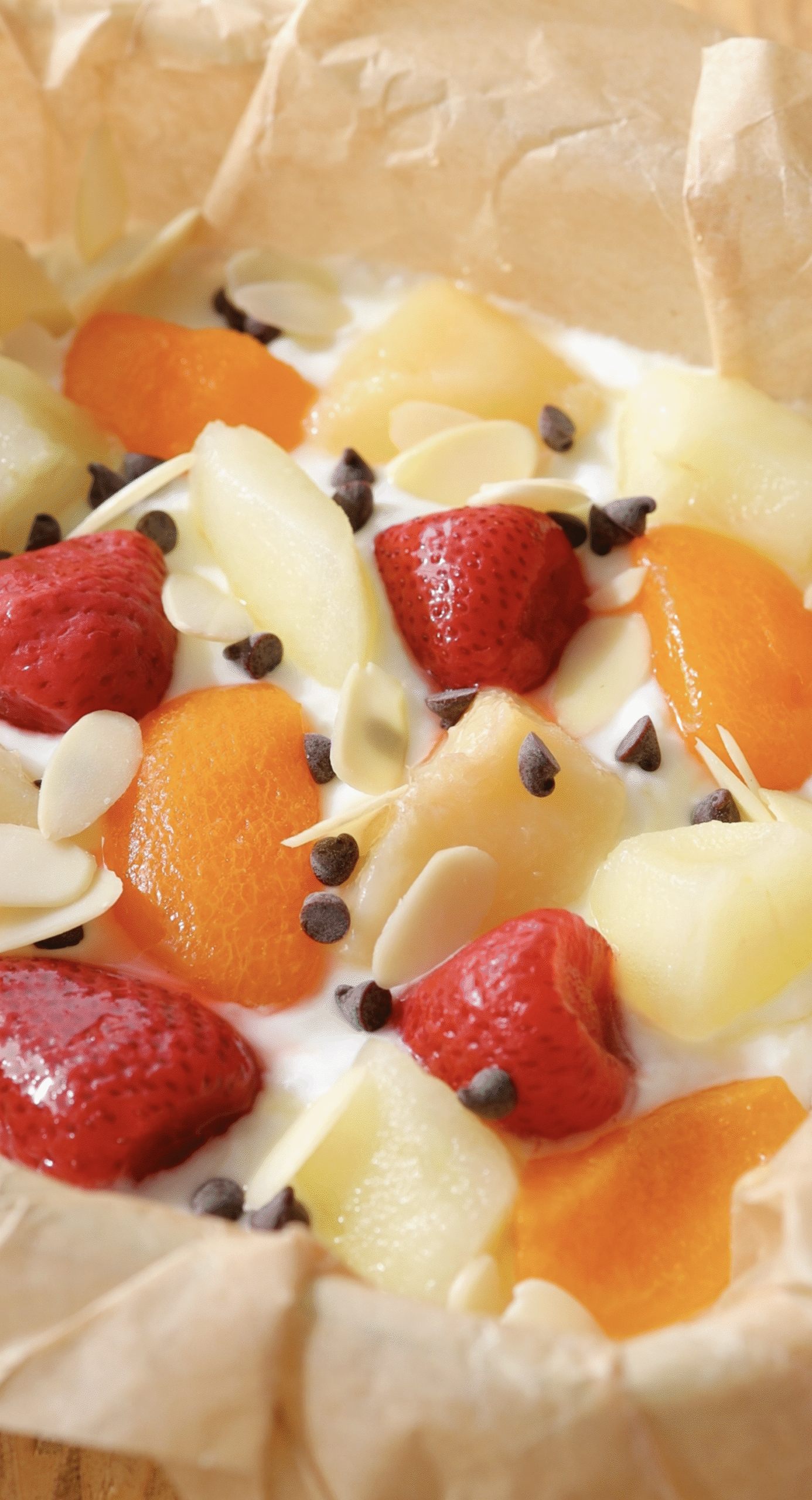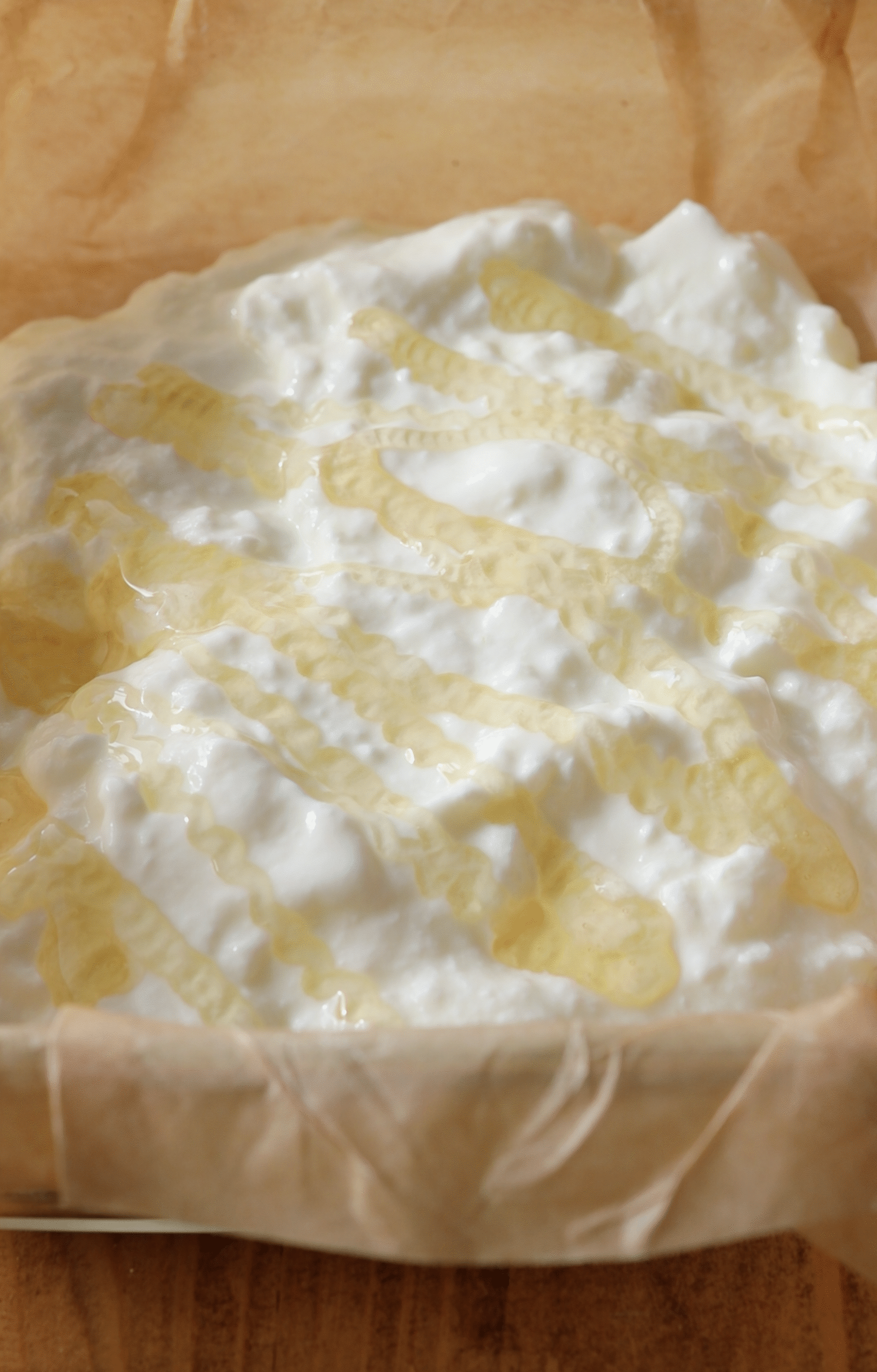 容器にクッキングシートを敷き、ヨーグルトを流し入れる。はちみつをかけて混ぜる。
